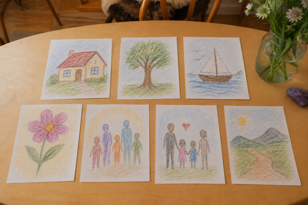 Det viktiga är inte att bilderna blir “fina”. Oavsett estetiskt uttryck använder bildtolkaren och klienten dem som utgångspunkt för ett reflekterande samtal, där hen utforskar de associationer och tolkningar som växer fram i mötet med bilderna.